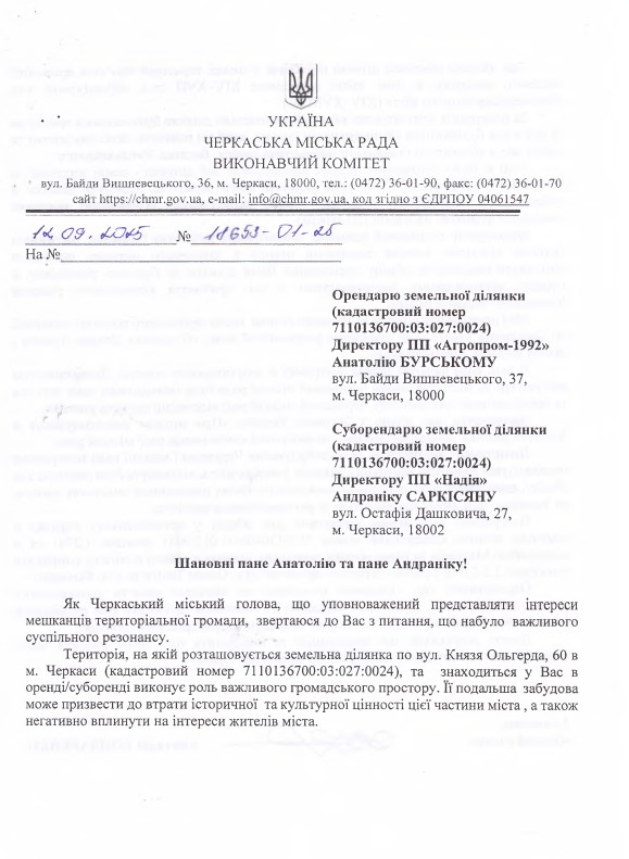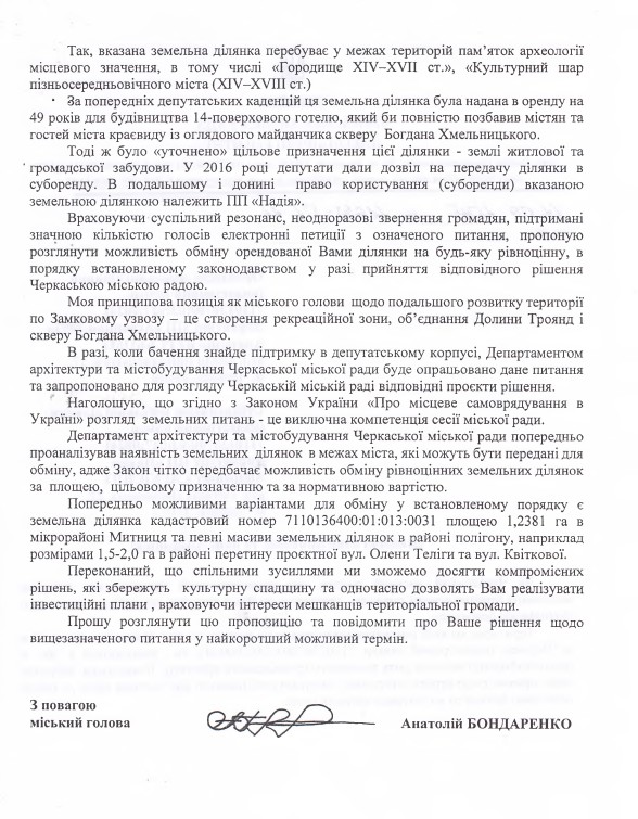 Черкаський міський голова Анатолій Бондаренко звернувся з офіційним листом до орендаря та суборендаря земельної ділянки по вулиці Князя Острозького. Там планується забудова, що викликала значний суспільний резонанс.