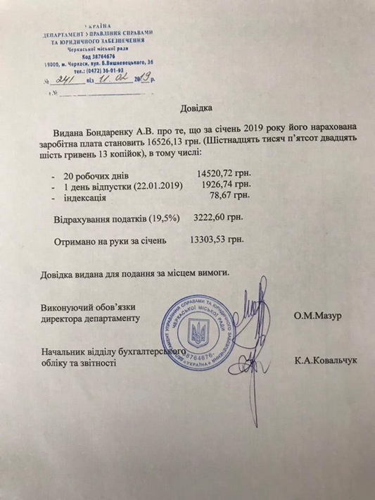 Так, за січень 2019 року його нарахована заробітна плата становить 16 526 гривень. А от отримано “на руки” за січень 13 303 гривні.