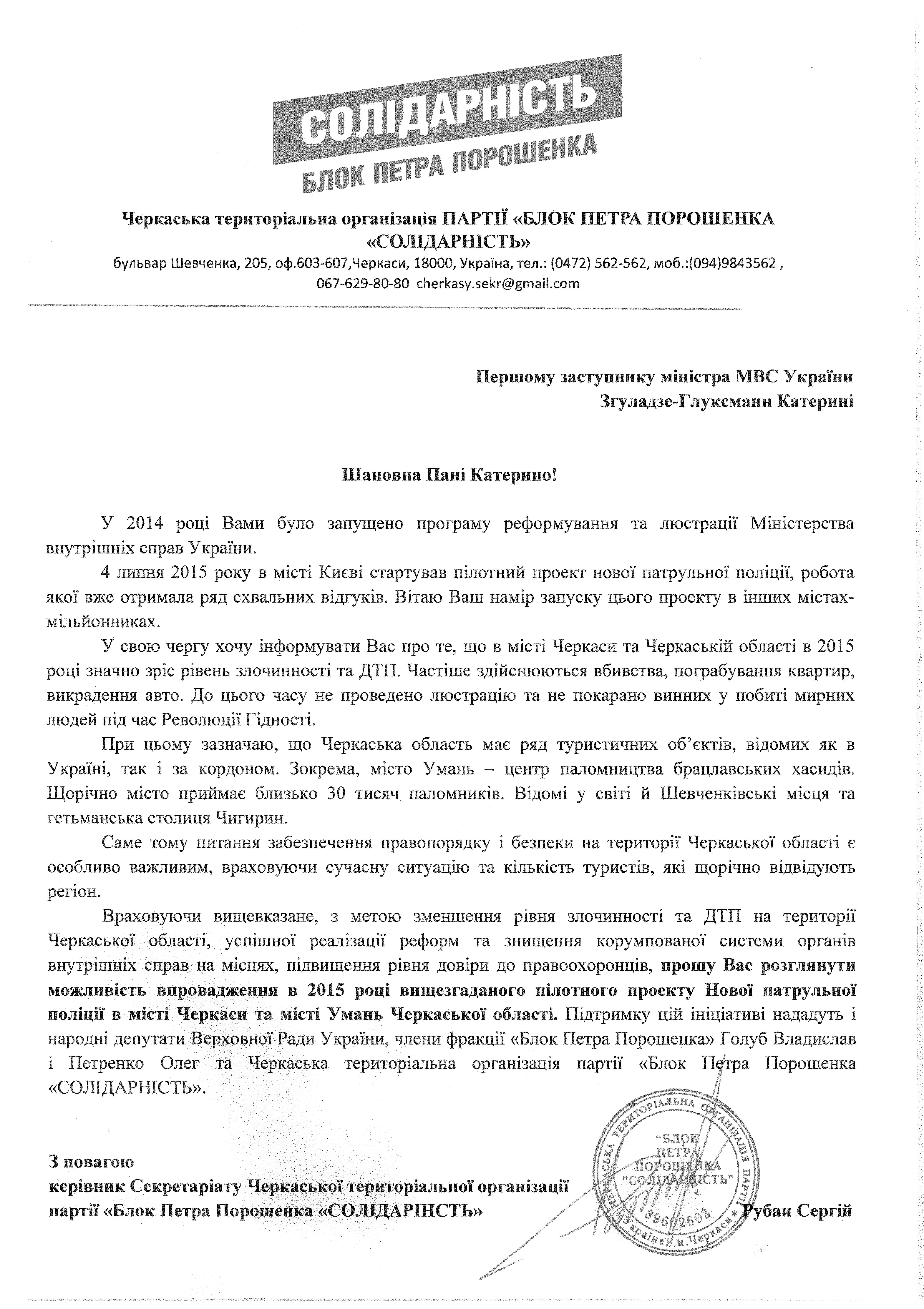 Керівник секретаріату Черкаської територіальної організації партії «Блок Петра Порошенка «Солідарність» Сергій Рубан звернувся листом до першого заступника міністра МВС України Катерини Згуладзе-Глуксманн. Він просить розглянути можливість впровадження пілотного проекту нової патрульної поліції в місті Черкаси та місті Умань вже цього року.