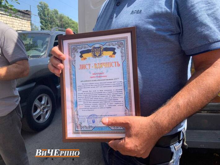 Один з українських захисників вручив цього дня волонтерам листи-вдячності від імені всіх бійців військової частини, яка отримала автівку.