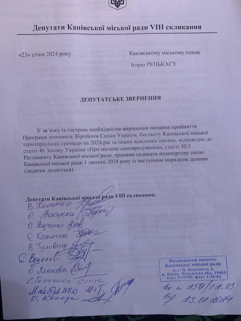 15 лютого 2024 року мала відбутися сесія міськради. Тоді майже в повному складі зібралися депутати у міському будинку культури. Однак її навіть не змогли розпочати, адже, за словами секретарки Канівської міськради, позачергова сесія, яка відбулася 4 липня 2023 року, не закрита. Адже на засіданні оголосили порядок денний, який включав сім питань. Одне з них вони не розглянули.