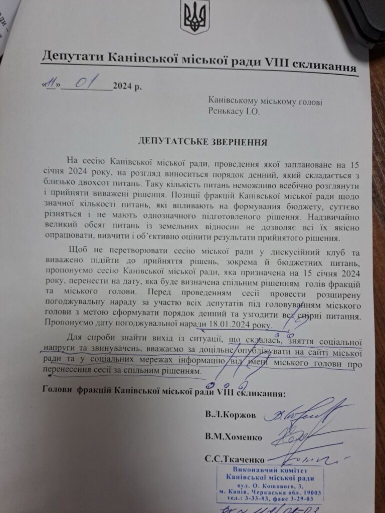 За інформацією пресслужби Канівської міської ради, міський голова Ігор Ренькас під час сесії 15 лютого закликав присутніх провести поіменне голосування за зняття останнього питання й завершення позачергового засідання. Проте голосів не вистачило. Депутат від партії “Зелені” Коржов наголосив, що таке голосування суперечить регламенту, адже, якщо всі рішення розглянуті, то закриття сесії оголошує міський голова.