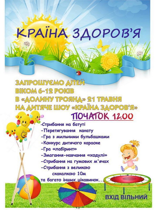 Цієї неділі, 21 травня, у Долині троянд відбудеться пізнавально-розважальна гра “Країна здоров’я”. На відвідувачів заходу чекає чимало локацій для активного відпочинку батути, стрибки на м’ячах, змагання-навчання “ходулі”, дитяче караоке, лабіринти, скакалка та інше.