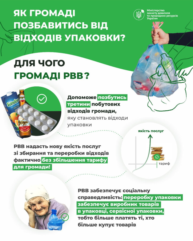 Наразі чекає на схвалення законопроєкт “Про упаковку та відходи упаковки”, який є складовою загальної реформи управління відходами в Україні. Саме його реалізація дозволить покрити всю країну системою роздільного збирання, упакування та відновлення цих відходів, а також упровадження РВВ допоможе перейти до економіки замкненого циклу. Відтак мільйони тонн ресурсоцінних матеріалів, таких як: папір, картон, пластик, скло, метали, деревина, не захоронюватимуться на полігонах, а отримуватимуть “друге життя”. Вони ставатимуть сировиною для вироблення нових продуктів.