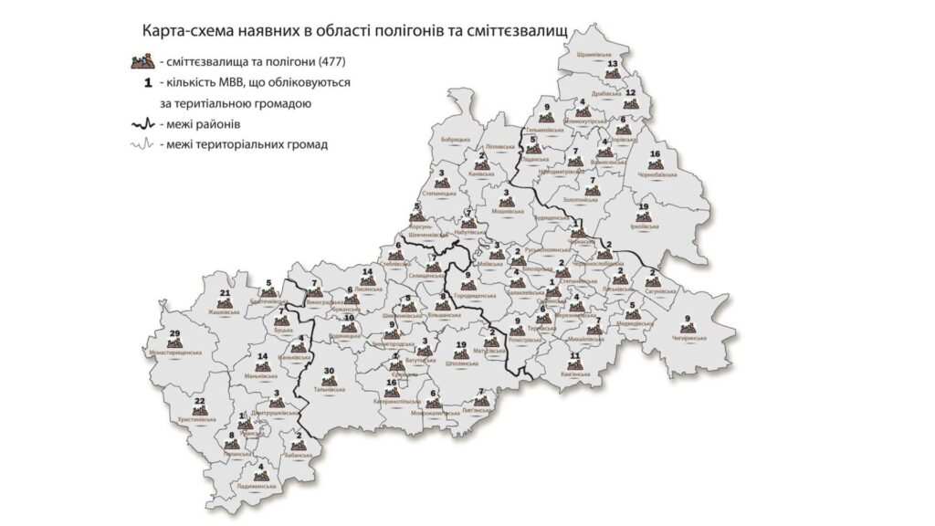 За словами начальника управління екології та природних ресурсів ОДА Віталія Петрова, на Черкащині обліковують 477 місць для видалення твердих побутових відходів, з них лише 197 мають відповідні правоустановчі документи, тобто інші — не є офіційно відведеними під сміттєзвалище.
