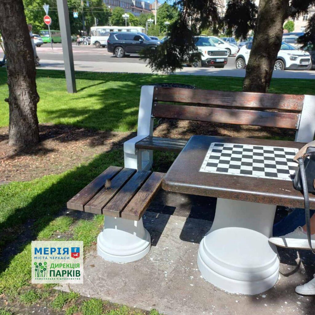 У сквері “Юність” освіжили фарбу шахових столиків, а в Сосновому бору подбали про відвідувачів атракціонів, створивши затінок спеціальною захисною сіткою від сонця біля кас.