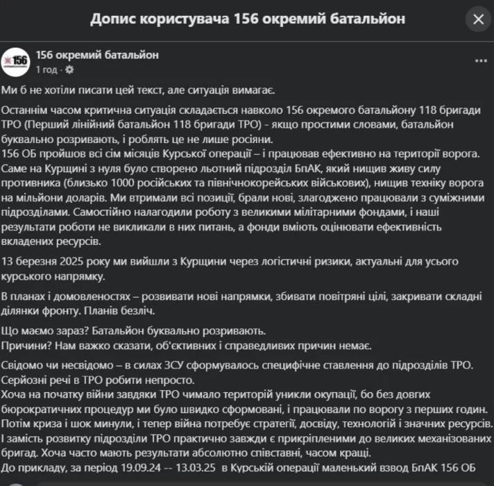 156 окремий батальйон 118 бригади ТрО виклав на своїй сторінці у фейсбуці заяву, в якій повідомив, що останнім часом у них склалася критична ситуація, “батальйон буквально розривають”.