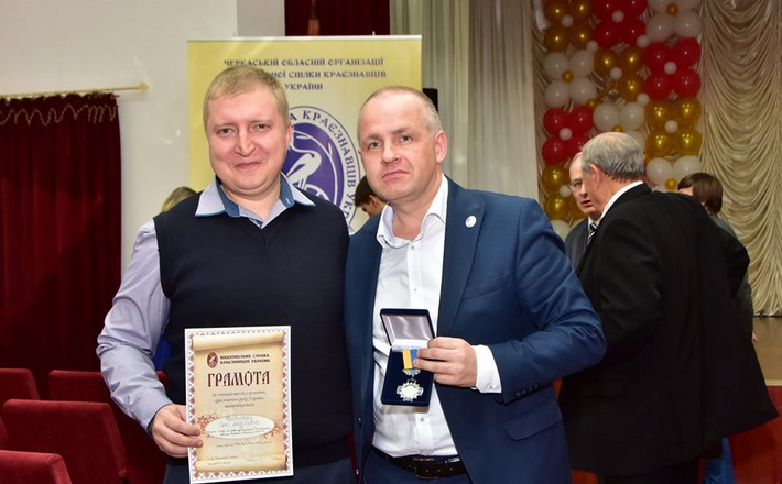Заступник голови обласної ради Андрій Сегеда нагородив медаллю “Гордість Черкащини” заступника голови обласної організації Національної спілки краєзнавців, проректора Черкаського державного технологічного університета Валентина Лазуренка.