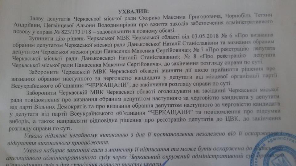 Суд заборонив МВК Черкас ухвалювати рішення щодо обрання наступним за чергою кандидата у депутати від місцевої організації партії ВО “Черкащани” та Вільних Демократів. Також у постанові суду є заборона щодо зачитувати їх на засіданні сесії Черкаської міської ради.
