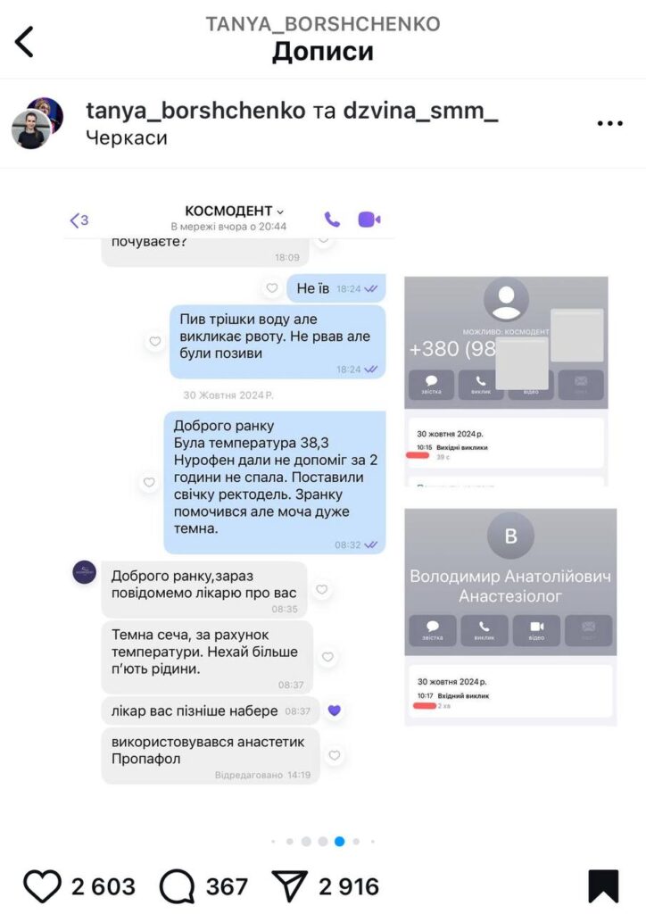 В обіцяний час лікарі “Космоденту” не зателефонували мамі, тож вона почала хвилюватися сильніше й вирішила дзвонити до медиків знову. Лише близько 10:30 з Тетяною Борщенко сконтактував лікар та порекомендував дотримуватися попередніх рекомендацій. У випадку, якщо це не допоможе — звернутися до педіатра.