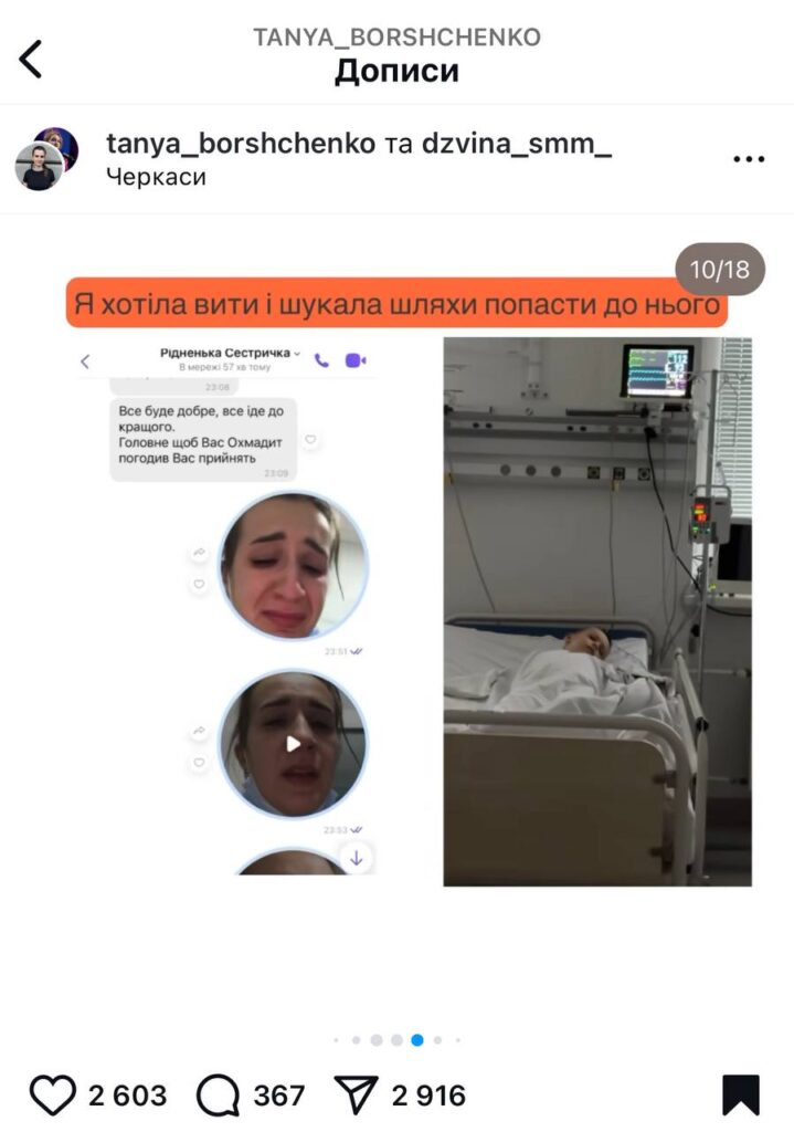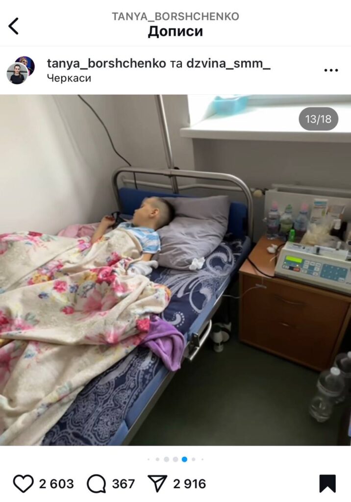 “Сину терміново почали капати плазму, але йому ставало лише гірше. Лікарі хвилювалися й постійно контролювали його стан. Близько 22:30 (ред. — 31 жовтня) нас перевели в Черкаську обласну дитячу лікарню. Зокрема, в реанімацію”, — розповідає Тетяна Борщенко.