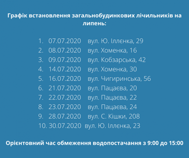 До вашої уваги графік встановлення загальнобудинкових лічильників на липень: