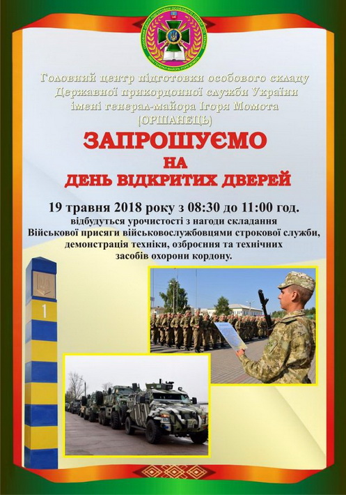 19 травня з 8-30 до 11-00 на території Головного центру підготовки особового складу Державної прикордонної служби України імені генерал-майора Ігоря Момота (Оршанець) відбудуться урочистості з нагоди складання військової присяги військовослужбовцями строкової служби, демонстрація техніки, озброєння та технічних засобів охорони кордону.