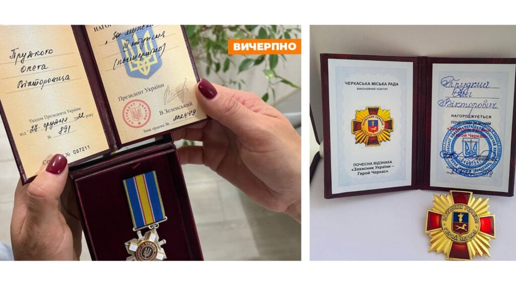 Указом Президента України Олега Прудкого нагороджено орденом «За мужність» III ступеня (посмертно). Також родина отримала почесну відзнаку “Захисник України — Герой Черкас”, а влітку цього року посмертну нагороду “За оборону України”.