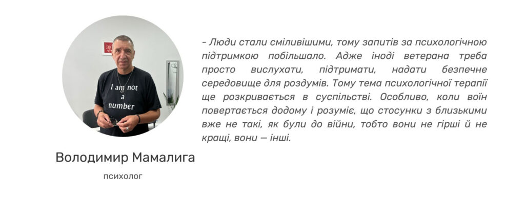 Зокрема, такою реабілітацією займається психолог, ветеран російсько-української війни Володимир Мамалига в центрі психології «Сяючий шлях» з 2016 року. У стінах центру психолог займається консультуванням, психодіагностикою та терапією з ветеранами, військовими та членами їхніх родин. Для них такі послуги є безплатними.