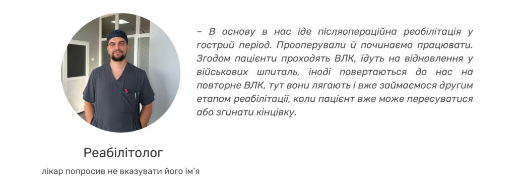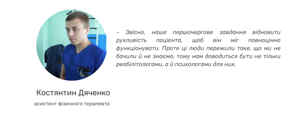 Костянтин Дяченко, асистент фізичного терапевта, зазначає, що реабілітація військових має свою специфіку, це люди, які пережили не тільки фізичні, але й психологічні травми, тож потребують відповідного поводження з ними.