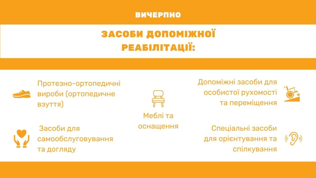 Такими є будь-які зовнішні вироби (пристрої, обладнання, прилади чи програмне забезпечення), спеціально виготовлені або загальнодоступні, основною метою яких є підтримка або поліпшення функціонування та незалежності особи.