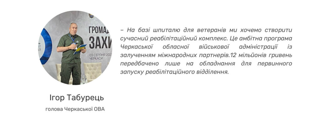 У перспективі, у кожному районі Черкащини буде визначений кластерний заклад, який надаватиме реабілітаційну допомогу. Центровим же реабілітаційним закладом регіону планують зробити шпиталь для ветеранів. Наразі там вже заплановані реконструкція та переоснащення реабілітаційних залів.