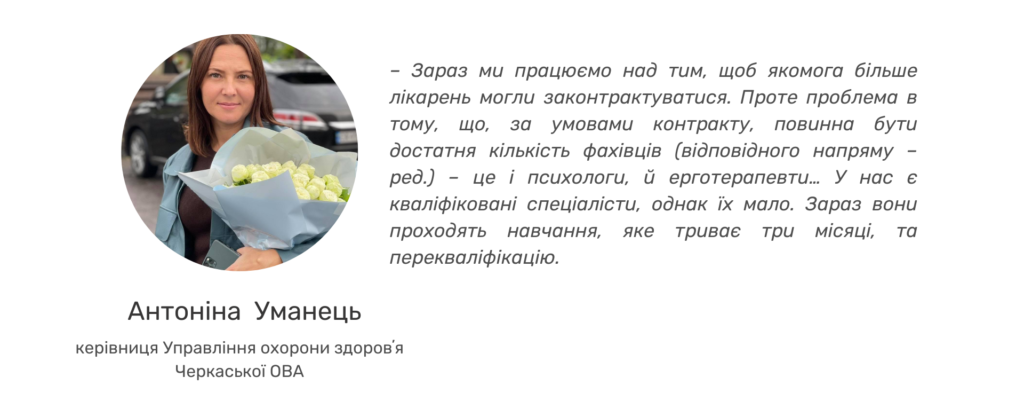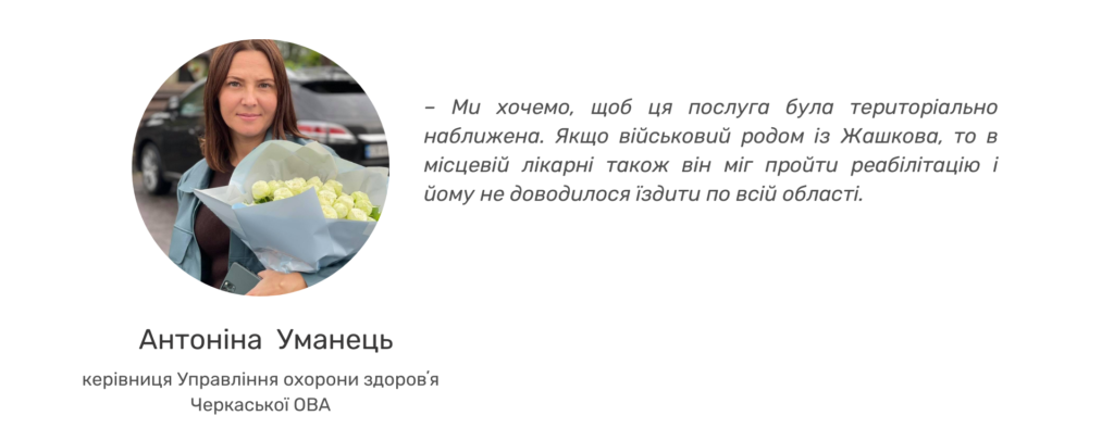 На Черкащині дев’ять медзакладів уклали договори із Національною службою здоров’я України на надання послуг із амбулаторної реабілітації. Шість медзакладів надають стаціонарну реабілітаційну допомогу. Увесь спектр послуг отримують військові безоплатно.