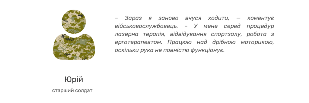 Старший солдат Юрій отримав мінно-вибухове поранення обох ніг і лівої руки. Коли військовий поступив до реабілітаційного відділення, то пересувався у кріслі колісному, потім на милицях.