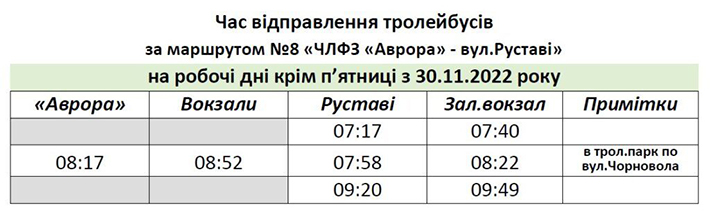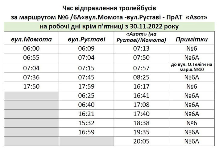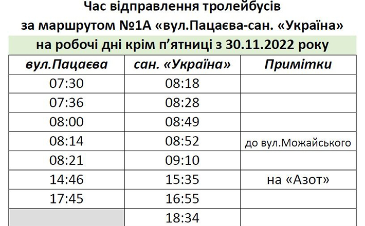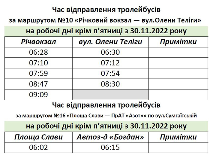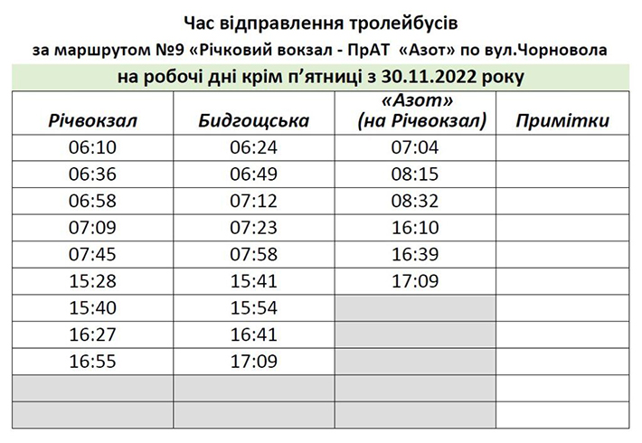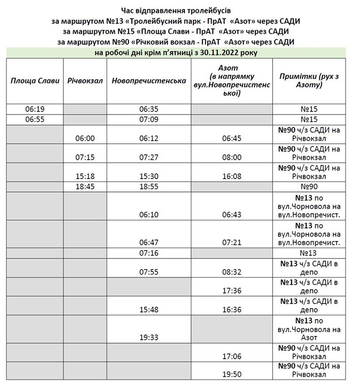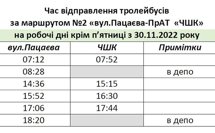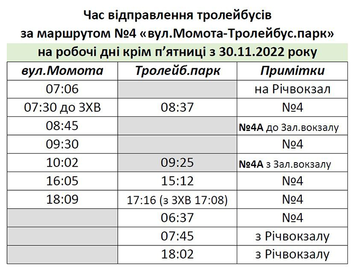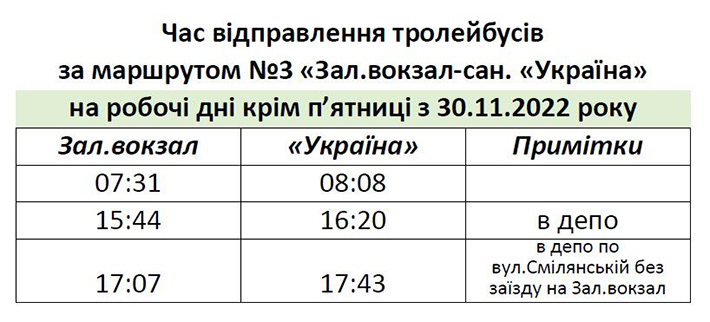 У “Черкасиелектротрансі” оприлюднили графік руху тролейбусів на сьогодні, 5 грудня. Електротранспорт курсуватиме за розкладом 30 листопада.