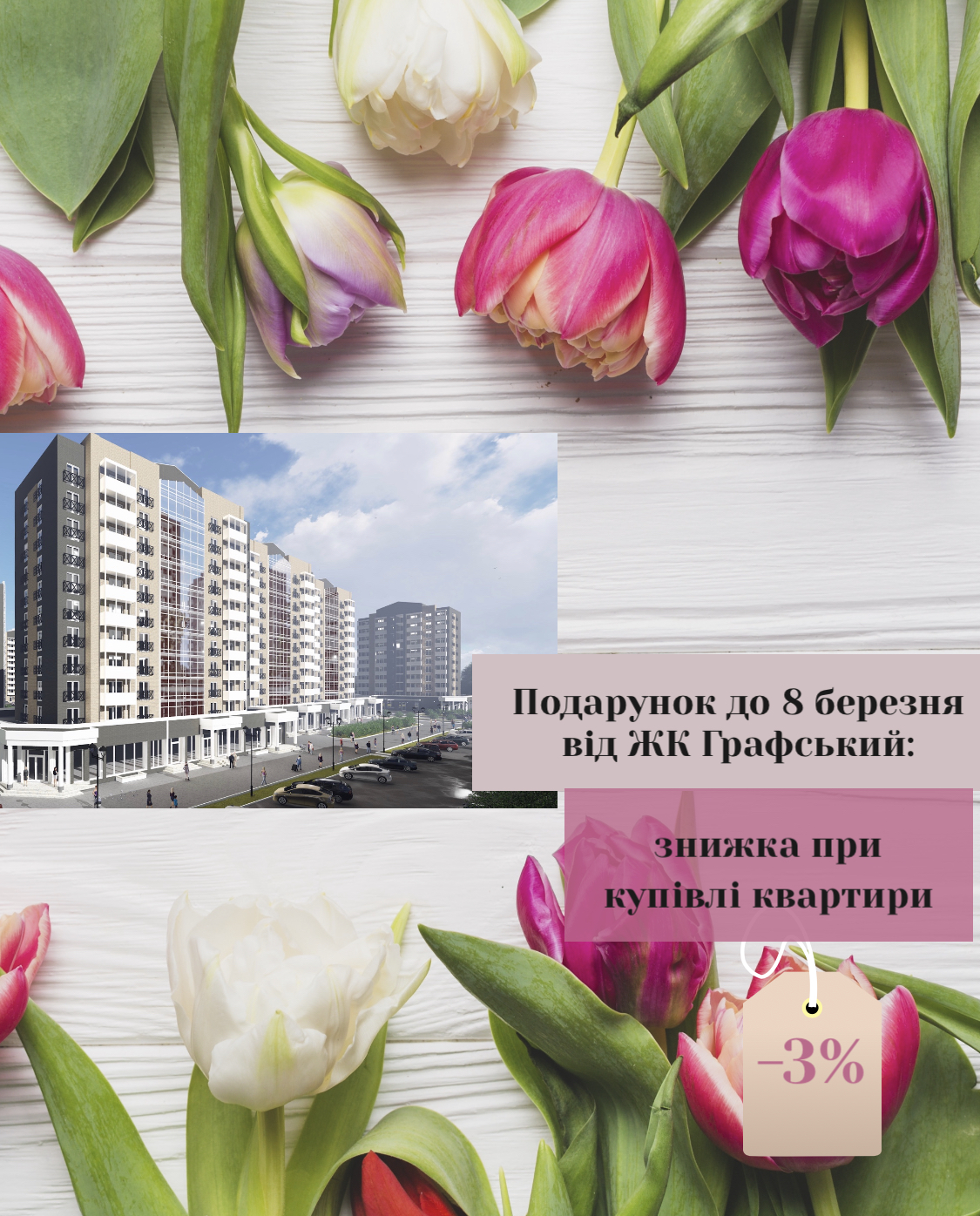 ЖК «Графський», що знаходить у самісінькому центрі міста Черкаси, приготував святкову пропозицію до 8 березня. Кожна жінка має змогу отримати 3% знижки на будь-яку квартиру. Акція діє до 12 березня.