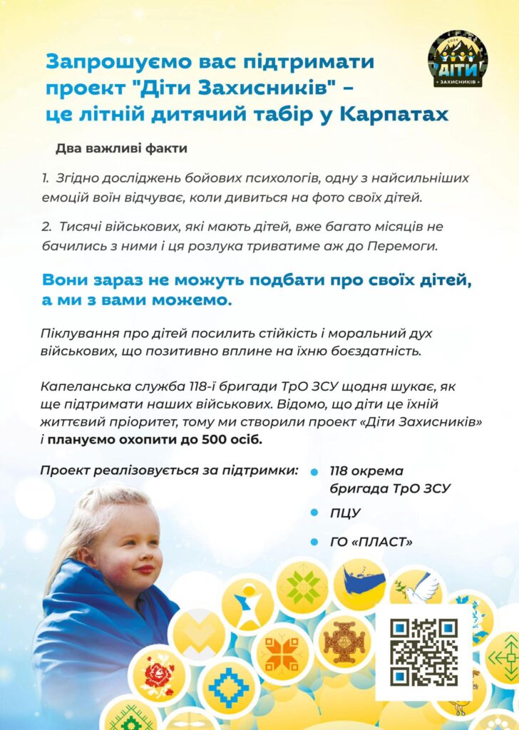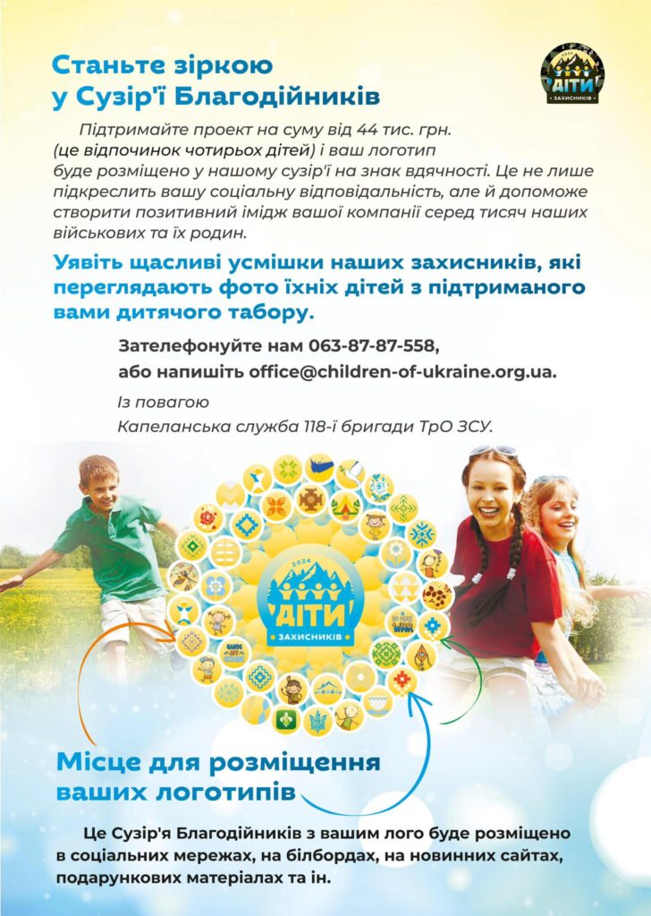 Також додають, що для тих, хто готовий профінансувати чотири путівки й більше (це від 44 тис. грн) капеланська служба підготувала «Сузір’я благодійників», де будуть розміщені логотипи спонсорів. Надалі це “сузір’я” буде розміщено на бігбордах, у соцмережах, на сайтах тощо. Щоб стати спонсором треба зателефонувати за номером: 063-87-87-558.